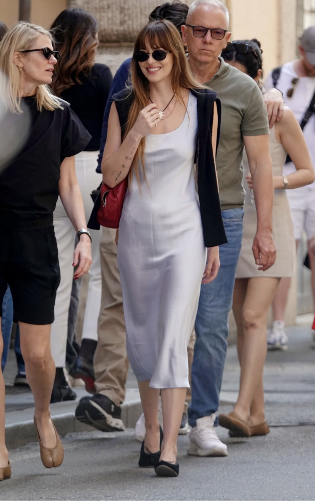 Dakota Johnson was spotted in Rome with her The Lost Daughter co-star Jessie Buckley wearing a sleek, minimalist look that felt both relaxed and polished. Her outfit centered on a blue Hai Florence Dress, styled with The Row accessories, Prada Oval Sunglasses, and a La Ligne cardigan for an easy, layered finish.