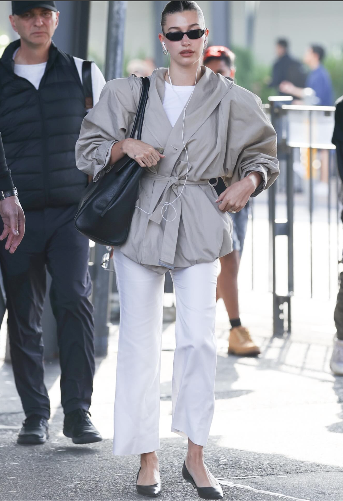 Her outerwear was the quiet hero of the outfit. Hailey wore the Magda Butrym Hooded Belted Cotton Blend Jacket in soft beige, a cropped trench style with sculpted sleeves, a nipped in waist and subtle volume through the hem. The piece combines the structure of classic tailoring with the ease of a lightweight layer, making it ideal for stepping off a long haul flight straight into a city full of cameras.